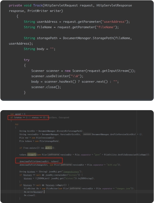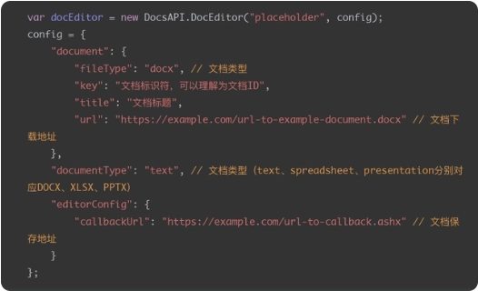 后端需至少实现两个接口,一个为文档的获取接口(即上面config中document的url),另一个为文档的保存接口(即上面config中editorConfig的callbackUrl)。