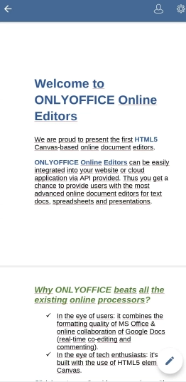 通过onlyoffice,您可以创建和编辑各种办公文档--文本文档、电子表格和演示文稿。基本格式是DOCX, XLSX和PPTX。同样支持所有其他流行的格式(DOC, XLS, PPT, ODT, ODS, ODP, DOTX)。