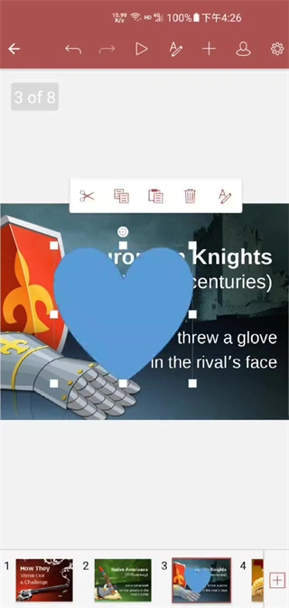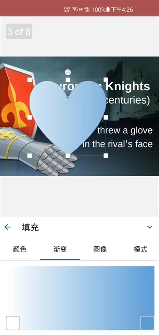 上面是单色填充,下面是渐变颜色,还支持图像、纹理等填充方式,电脑端的幻灯片的填充方式现在都可以在手机端上使用了