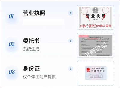 3、上传所需证件:上传符合要求的营业执照、委托书,个体工商户还需上传经营者身份证复印件