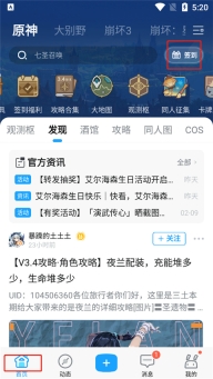 1、进入米游社软件首页,我们可以看到右上角有一个签到笔记图标;