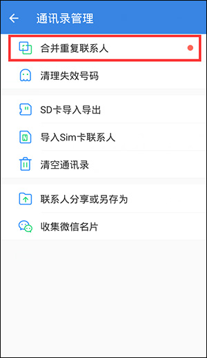 请于右下角【我的】菜单里,找寻【通讯录管理】选项,“合并重复联系人”功能就在其中。点击进入该功能后,依照指引操作便可。