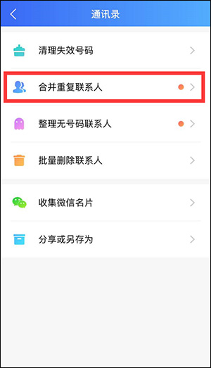 您可在右下角【我的】菜单里,找到【通讯录】选项,该选项中具备“合并重复联系人”功能。点击进入此功能后,依照相关指引操作就行。