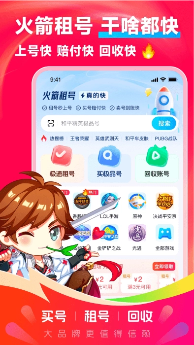 火箭租号,一款便捷好用的手机租号软件,能让用户尽情享受体验高端账号的乐趣。在这款软件里,为用户精心准备了各式各样不同游戏的账号,既有如王者荣耀、CF、火影忍者这类当下热门的游戏账号,也涵盖一些经典老游戏的账号。而且,用户只需花费少许资金,就能畅享顶级账号。关于账号的具体情况,在购买时可一目了然,轻轻松松就能租到自己心仪的账号。更关键的是,该软件还提供安全保障。