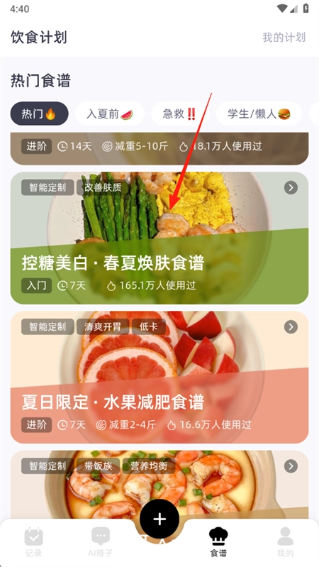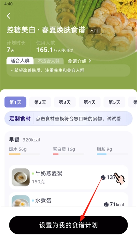3、点击食材可替换,设置完成后点击设置为我的食谱