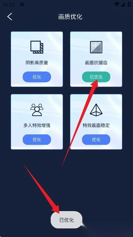 4. 确认设置内容后,点击【优化】按钮,即可启动优化流程,完成后下方将自动显示“已优化”状态提示,表明当前配置已生效。