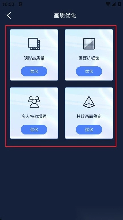 3. 点击【画质优化】进入细节设置区域,系统提供如高质量阴影处理、抗锯齿提升、多人物像特效增强及画面稳定性增强等多种调节参数。