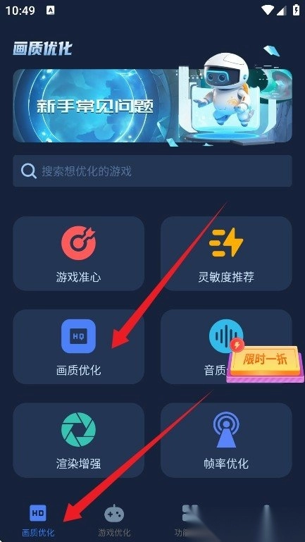 2. 在主界面中可见多个优化选项,涵盖游戏准星调整. 灵敏度调节. 画质强化与音质增强,功能分类清晰,便于操作。