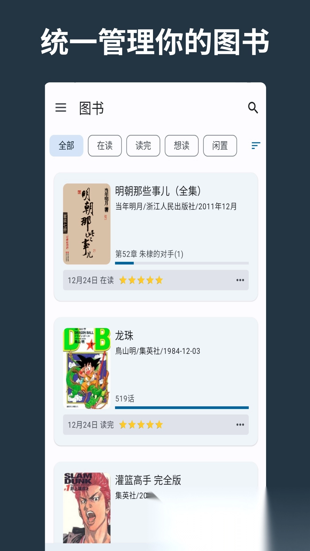 2. 多种状态记录,如在读、已读、放弃、想读、闲置等等分类管理。