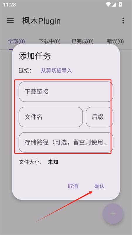 4.然后输入链接、文件名等信息,点击确认即可