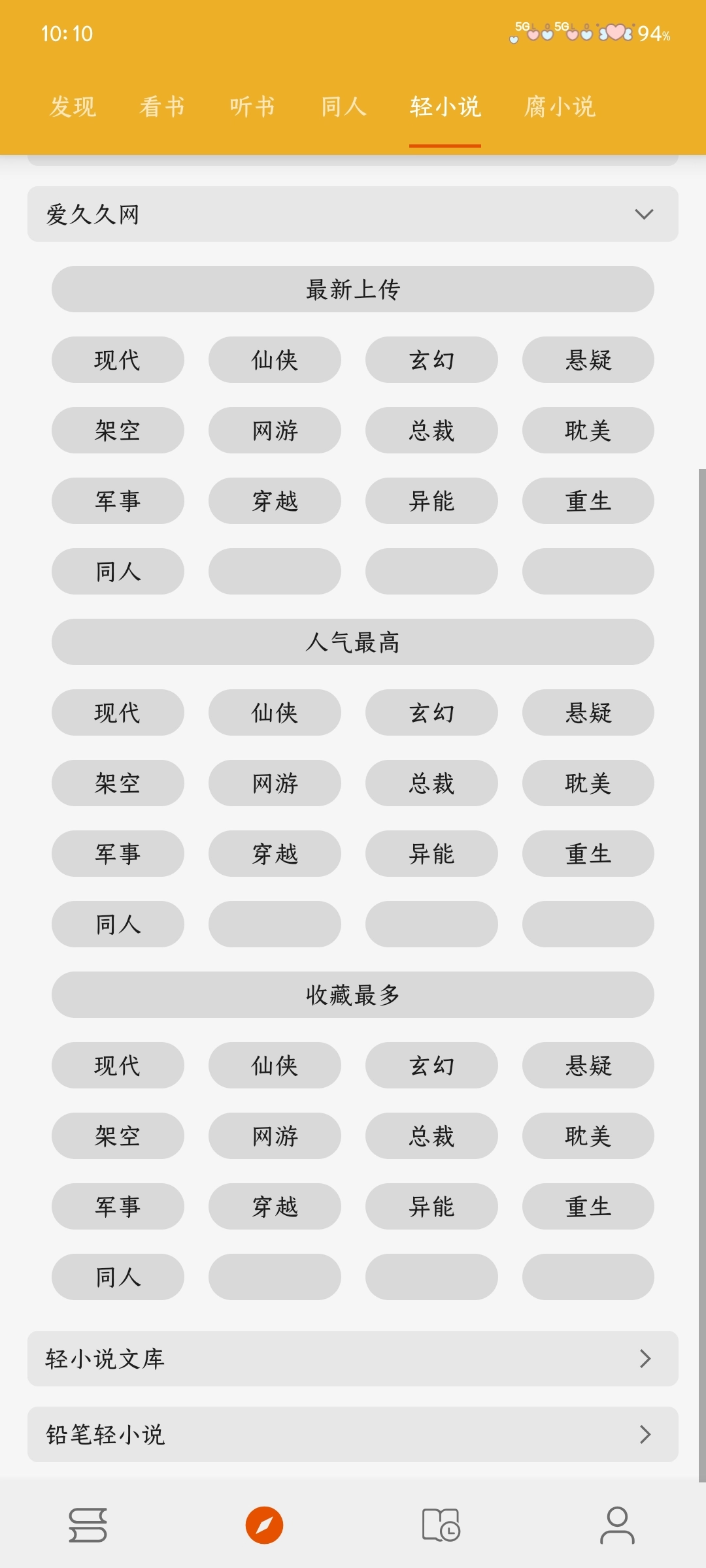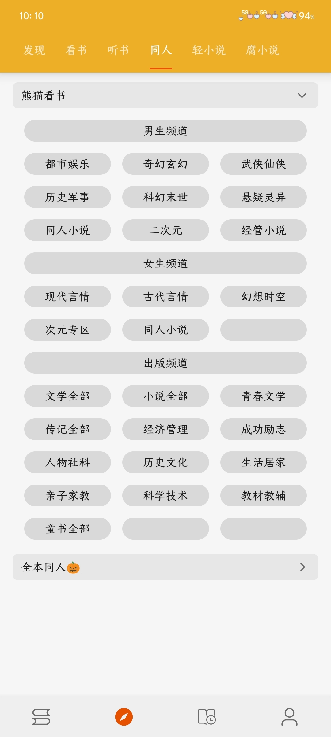 1.打开桔子阅读器App,进入发现页面,通过滑动切换标签,如看书、听书、同人等
