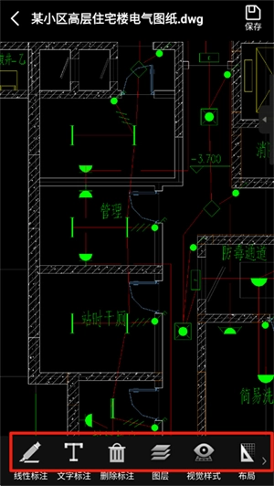 4、打开之后可以在下方操作栏对图纸进行标注等操作,双指缩放图纸