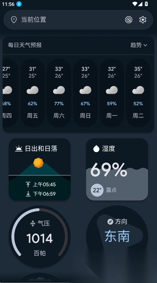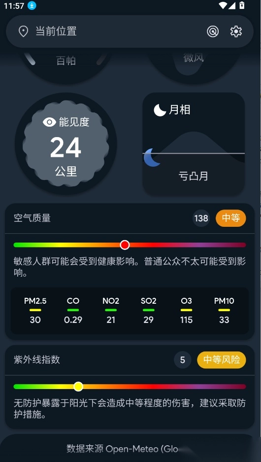 除了常规的天气预报、风向、雨量、能见度等等,还能查看月相、气压,并且也支持查看雷达云图。几乎每一种卡片都能点击进入查看更详细的数据,甚至我们还能在这里学到一些气象小知识。