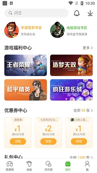 4、最后,点击福利,分为专区与电脑专区,这里都是有关游戏的福利。