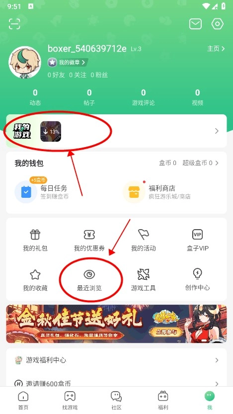 1、在我的界面,点击我的游戏和最近浏览即可查看;