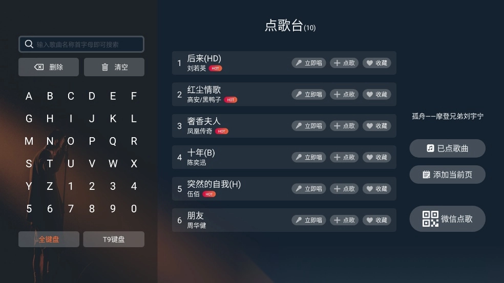 3. 进入点歌页面输入名称点取想要唱的歌曲,也能查看已点播的歌曲列表。