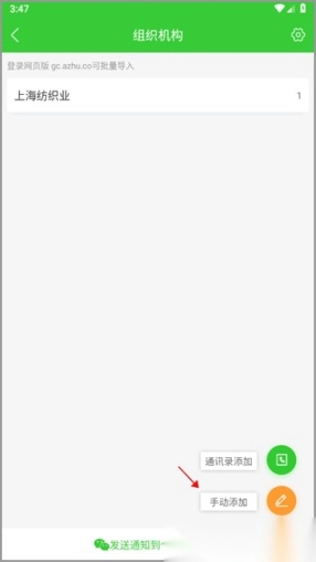 3.以手动添加为例,输入员工的手机号,个人信息以及所在部门等,添加好后点击下方“添加并发短信……”,这样员工就会收到这份短信,你也添加成功了。