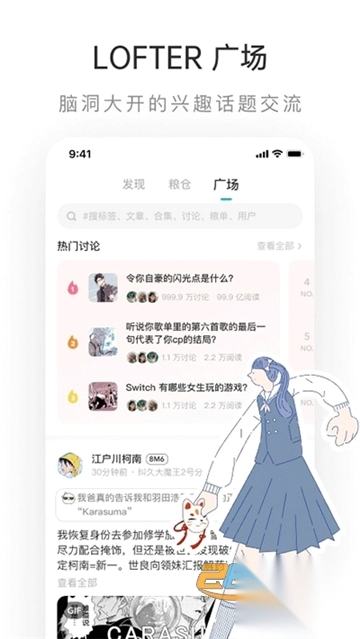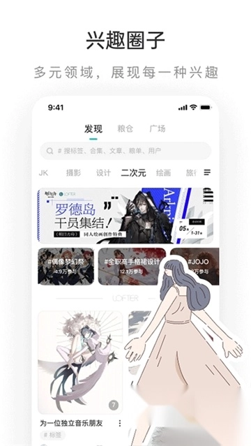 追剧党、电影发烧友、绘画爱好者、手账狂热分子、饭圈女孩/男孩、国 风党、娃妈娃爹、摄影爱好者、旅行达人、COS圈内人、党、文学 爱好者⋯⋯ 只要你想得到,LOFTER都有专门的标签可以承载你的兴 趣,找到和你一起产出、围观、讨论、分享的小伙伴。当然,也请你努 力学习标签礼仪,和我们一同维护标签秩序。