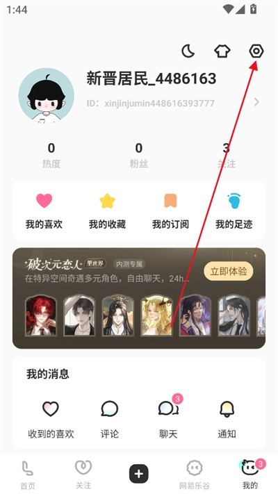 在个人中心页面,点击右上角的设置图标。