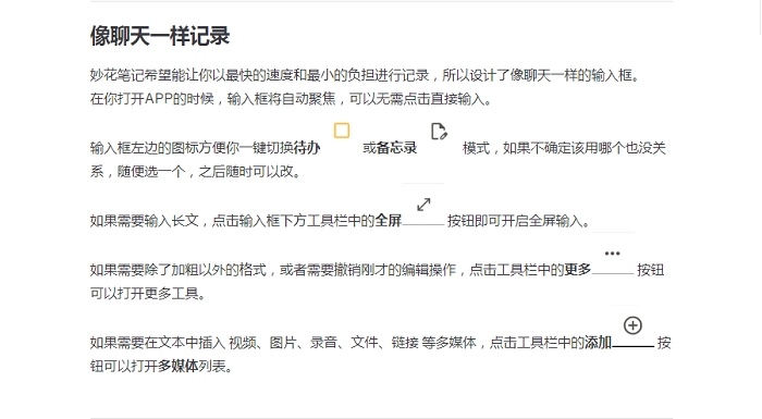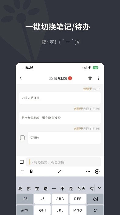 一键切换随笔/待办,图文混编,插入图片,视频,文件,网页链接,随手画两笔,一边录音一边打字