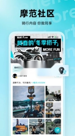 智能车载终端,CFMOTO全系列车型都搭载这款系统,集合防盗、监控、确定方位及摩范圈社区等一系列人机互动和信息互动功能,是一款专业为摩托车爱好者量身定制的移动。CFMOTO 致力于打造优质、有影响力的摩托车社区摩范圈MORE FUN,为广大摩托车爱好者提供分享、交流和内容的互动平台。
