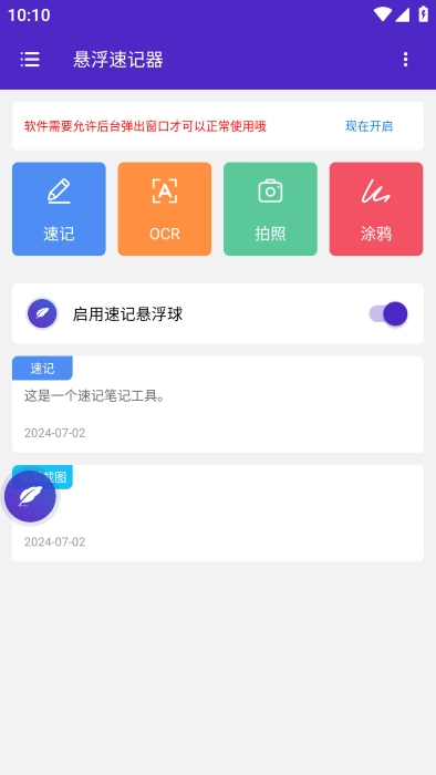 悬浮速记器能快速记录你的事务,只需轻点悬浮球,就能立即进入记事界面,简洁明了地让你掌握所有事项。它还具备拍照处理功能,支持多种实用功能,满足你在不同场景下的使用需求,方便至极。快来体验一下吧!