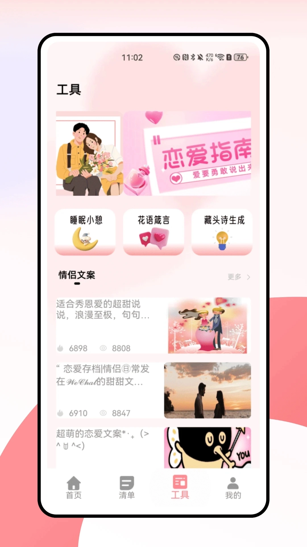 “云玩”以其独特的互动方式和贴心的功能设计,重新定义了数字时代的社交模式。它不仅仅是一个简单的娱乐工具,更是连接心灵的纽带,让每一段关系都变得更加美好而有意义。如果你正在寻找一种新颖的方式来加强与他人的联系,那么“云玩”绝对值得一试!云玩是一款专为情侣与好友打造的趣味互动神器!首页聚合真心话大冒险、幸运转盘挑战等爆款社交游戏,搭配你比我猜默契考验,让聚会不再冷场;恋爱纪念日精准倒数,记录甜蜜瞬间。清单页支持心愿共享与情侣专属记账,让生活更有仪式感。工具页暗藏睡眠小憩白噪音、花语百科与藏头诗生成器,从娱乐到实用全面覆盖,开启云端玩趣新体验!