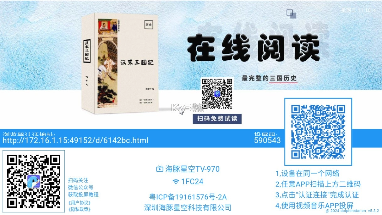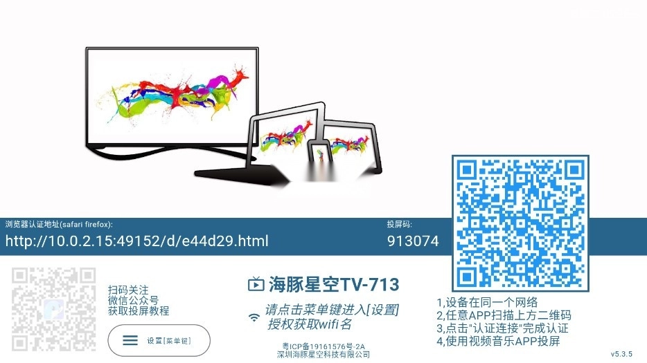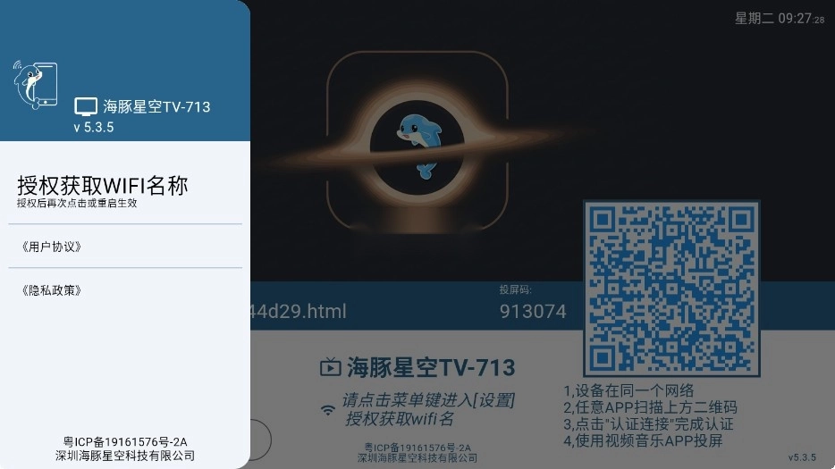 1,应用市场安装在电视上的应用市场搜索[海豚星空投屏],在线安装。