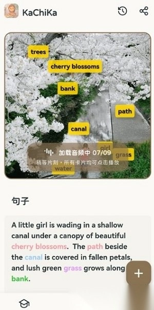 6. KaChiKa会自动识别用户导入的素材,智能生成学习语言单词,并配上一段句子进行图片描述