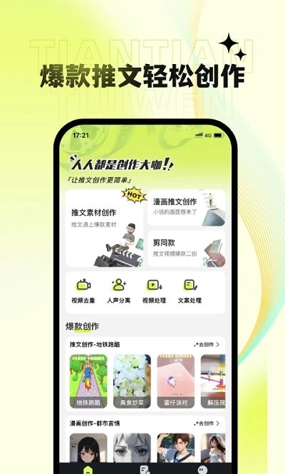 天天推文免费版,专注于简化小说推文创作流程。无论你是初涉此道的新手,还是经验丰富的创作达人,这里便捷高效的创作方式,定会让你眼前一亮,轻松上手。快来打造专属你的作品吧!平台拥有海量热门素材库,能满足你多样化的内容需求,助你的推文脱颖而出。热烈欢迎对此感兴趣的广大用户前来体验,点击即可开启创作之旅!