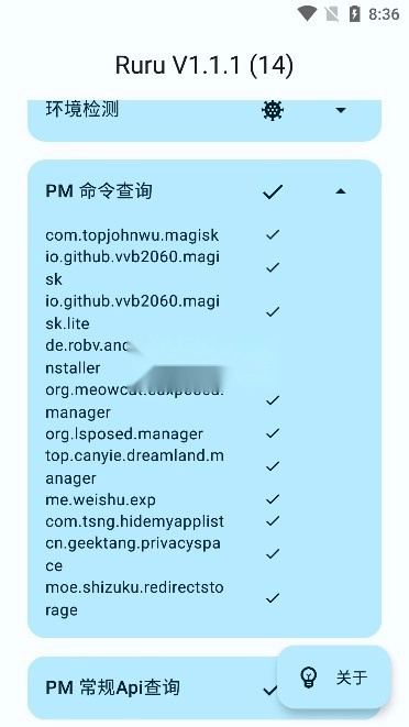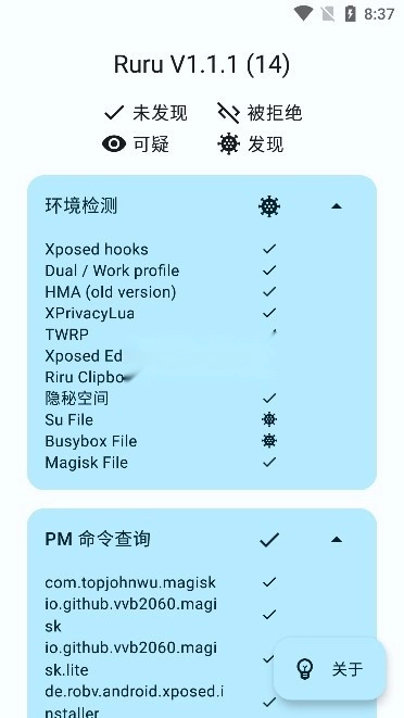一个应用软件检测工具,类似于momo的root检测工具,相较于momo检测范围更广,检出率更强。用于检测magisk manager等可疑应用程序,速度很快,界面也很个性,虽然没有许多繁杂的功能,能够完美兼容各种机型,精准、快速、高效、安全、稳定,使安卓系统在使用过程更加轻松方便!
