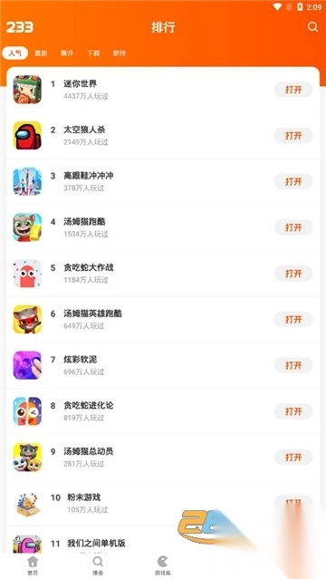 排行榜主要分为人气、最新、飙升、和期待榜,可以轻松找到近期热门游戏,或者预约即将上线的新游戏。