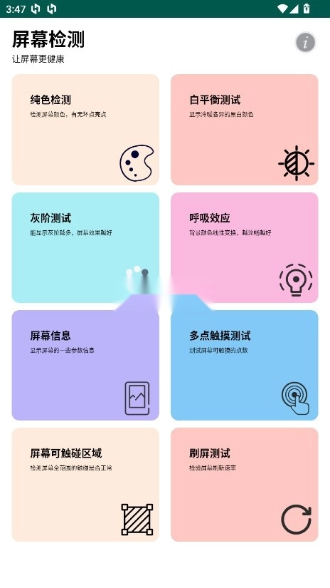 屏幕检测是一款手机屏幕检测工具。屏幕检测帮助手机用户发现屏幕存在的问题,使用简单,检测轻松,支持屏幕检测、灵敏度检测、屏幕信息查看等多种功能,一键测试手机。