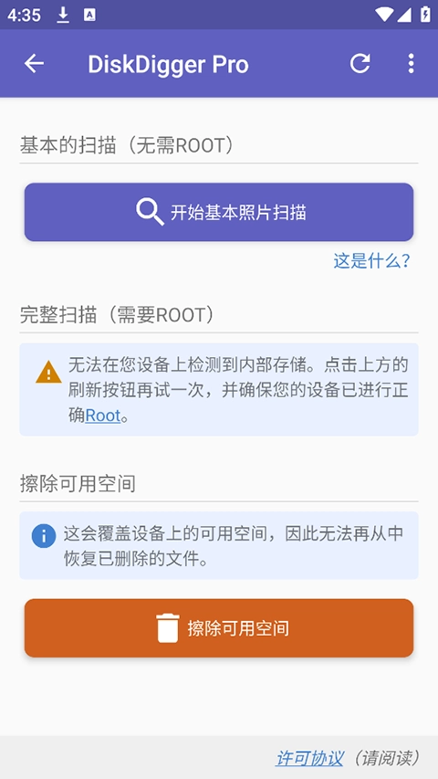 2、注意:如果您的设备没有植根,该应用程序只能对已删除的照片执行“有限”扫描。为了能够搜索其他类型的文件,并搜索您设备的整个内部存储器,设备需要获得 root 权限。在非 root 设备上,该应用程序只能恢复它在设备缓存和缩略图目录中找到的低分辨率版本的照片。