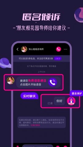 1、在秘密花园,没有人会知道你是谁,你可以匿名倾诉,随时随地在线聊天沟通,诉说个人秘密、烦恼,释放生活压力。