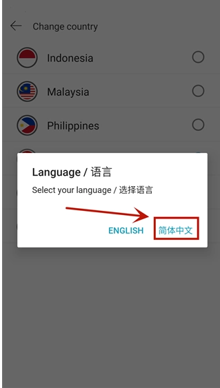 3、点击国旗图标将地区设置为新加坡,点击continue后,在弹出的对话框内选择简体中文即可设置成功。