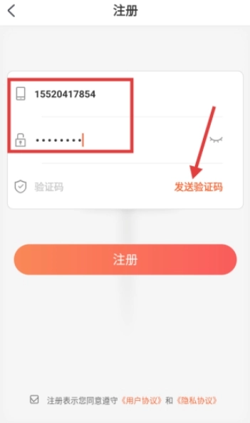 2、在注册页,填写手机号、密码后,点击【发送验证码】获取短信验证码