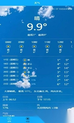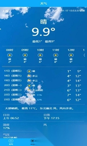 总体而言,页面简洁又简约,各项操作清晰明了,极易上手,适用于各个年龄层。这里不仅提供当天的详细天气信息,还涵盖未来40天内的天气预报与温度。一键登录,更可畅享诸多功能,快来体验吧!
