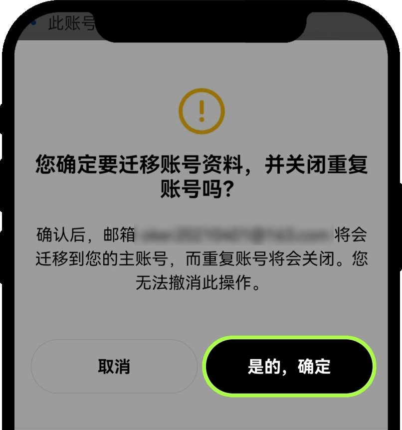您登录的账号为主账号,被迁移手机号或邮箱的账号为重复账号,迁移完毕后重复账号会被关闭,为防止资产损失,请在迁移关闭账号前,将被迁移账号中的资产全部转出。