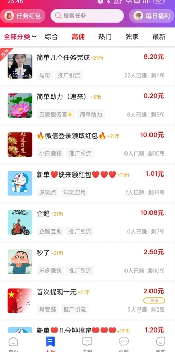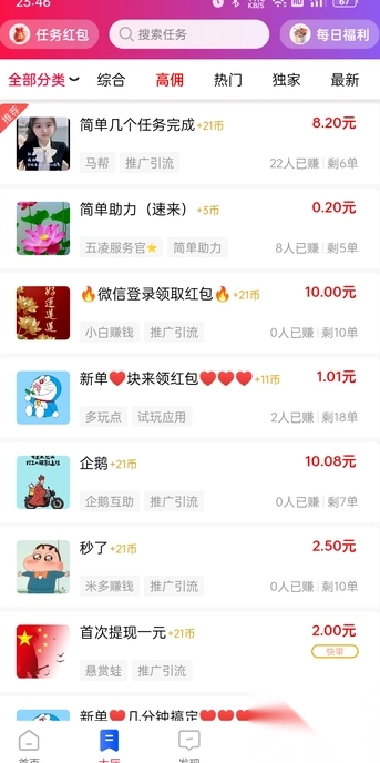 3、任务完成后,用户提交成果,经发布方审核通过,佣金将在规定时间内自动发放至用户在 内的钱包账户。