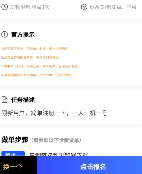 1、用户进入任务详情页,可查看详细的任务要求、操作步骤、完成时间节点与佣金金额。
