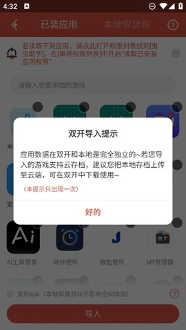 3、同时虫虫助手双开空间支持本地导入和直接两种方式将应用安装在双开空间内,界面简洁,操作方便,占用资源少。
