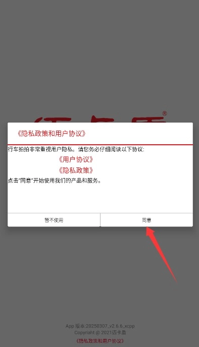 1. 首次启动行车拍拍时,需完整阅读《用户协议》与《隐私政策》,确认同意之后,点击进入设备连接主界面。