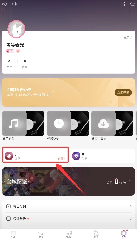 2、进入个人中心页面后,点击显眼的"充值"按钮,跳转至充值金额选择界面。