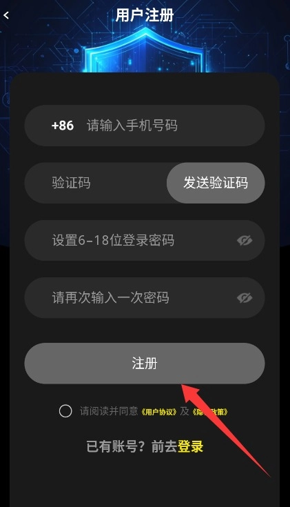 2、填写有效手机号码并获取验证码,设置登录密码后勾选协议完成新账号注册。