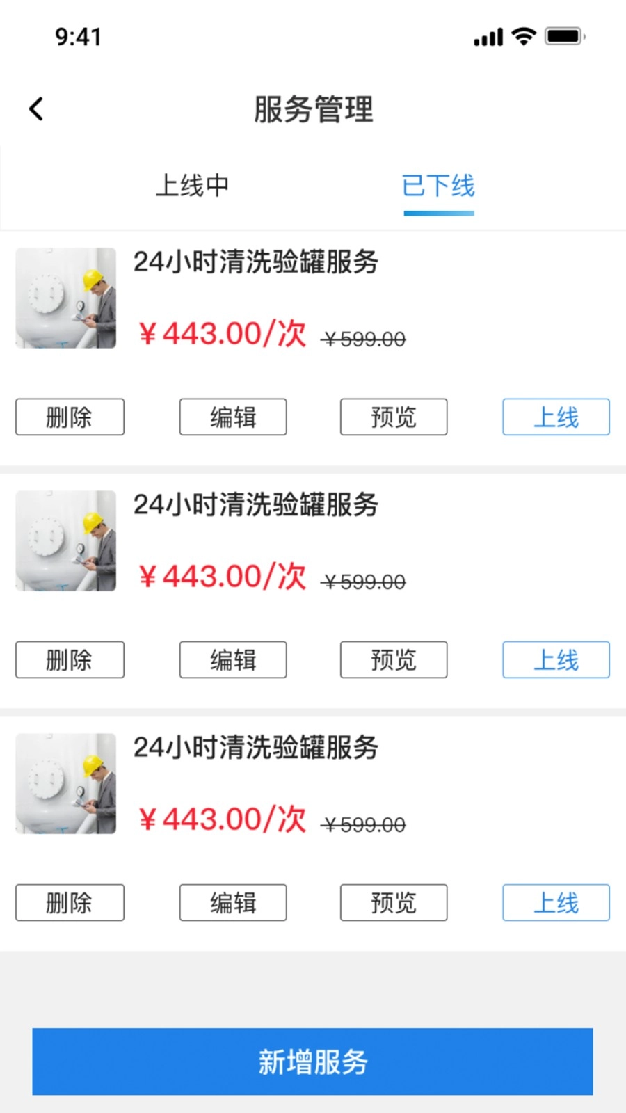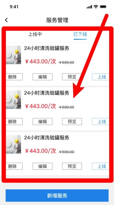 5. 于货满e家的服务管理界面当中,对所有已上线以及已下线的服务项目具体详情进行查看。