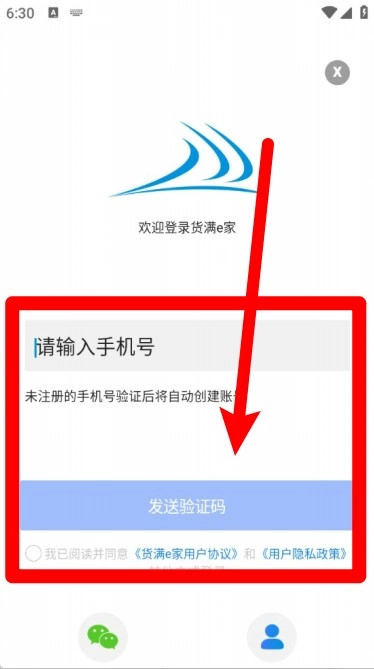1.打开货满e家商户端,输入手机号后发送验证码并验证登录。