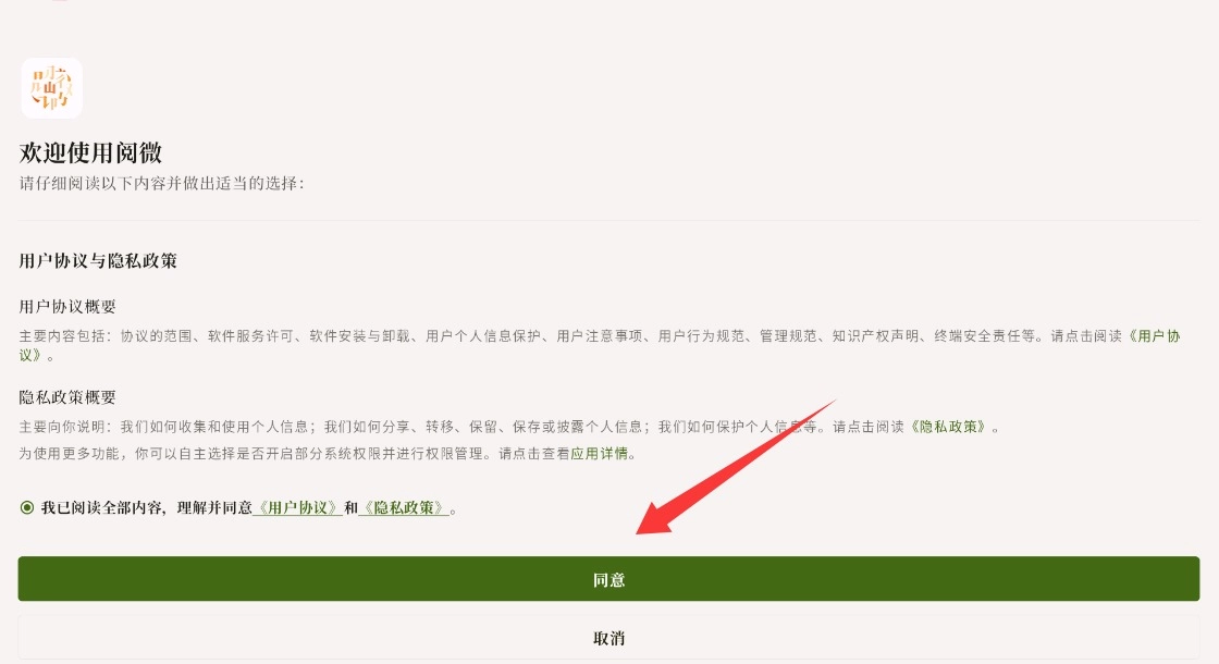1. 当首次运行阅微时,系统会呈现用户协议与隐私政策,您需仔细阅读,之后点击“同意”按钮,方可进入主界面。