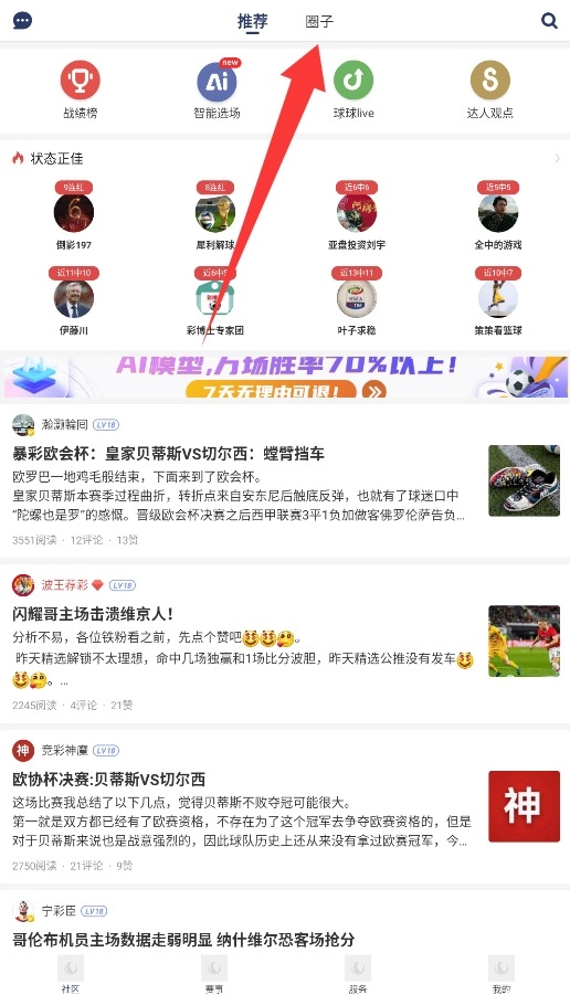 3、进入社区页面后,点击导航栏"圈子"选项,通过底部发布按钮即可创建并分享新的圈子动态内容。
