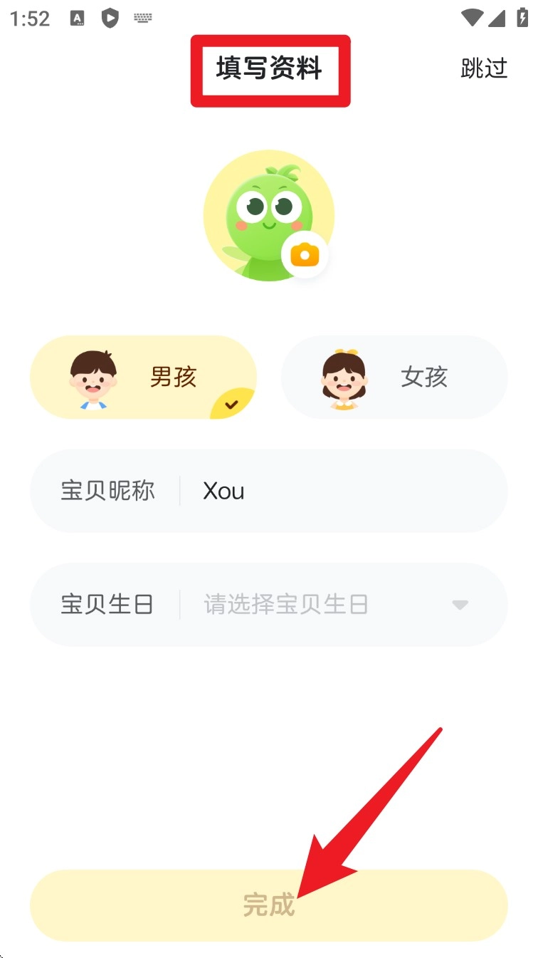 2. 系统会引导你填写宝贝信息,包括昵称、性别与生日,用于生成个性化学习计划。